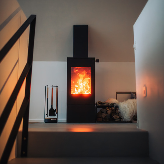 Grazie alla sua posizione, la stufa collega visivamente la cucina, la zona pranzo e la zona giorno. Il fuoco può essere ammirato da ogni prospettiva e conferisce struttura e calore allo spazio aperto.